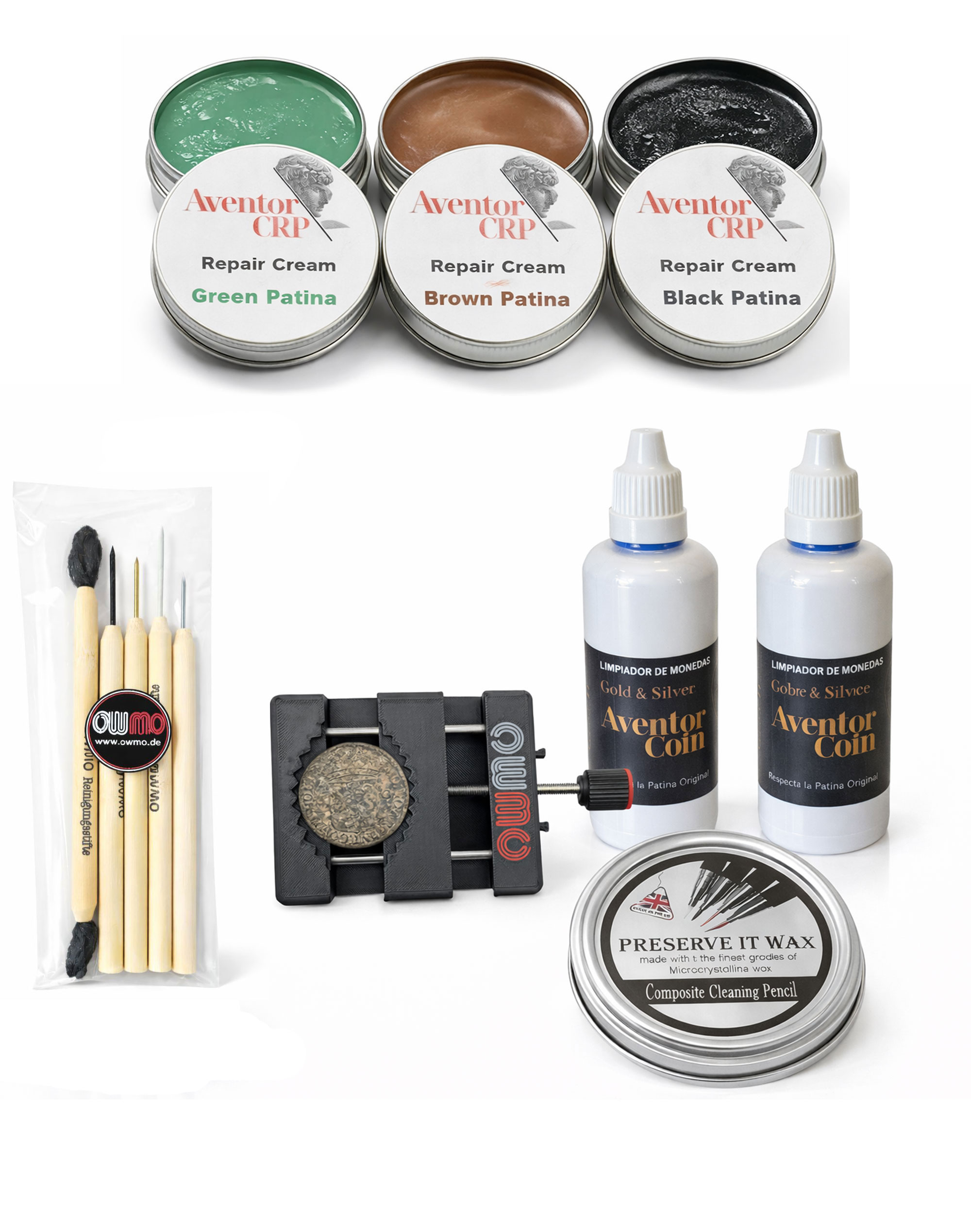 Das OWMO Reinigungsset XXL deckt damit alle Schritte von der Reinigung über die Fixierung bis zur Konservierung und Patinapflege ab und ist ein hochwertiges Rundum-Set für die langfristige Werterhaltung von Münzen und Funden.